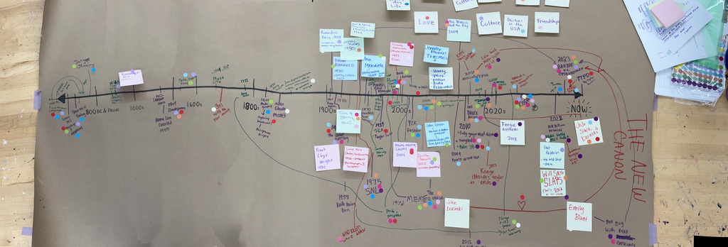 Students will redesign the canon by collaboratively creating a timeline of the media they find relevant in their lives. Students will begin with a brainstorm to generate ideas, with the understanding that art is not limited to visual arts (think: music, movies, memes, etc!). During and after making their timeline, students will be asked to identify themes prevalent in the timeline and examine the patterns that arise, and the significance of themes in artmaking.