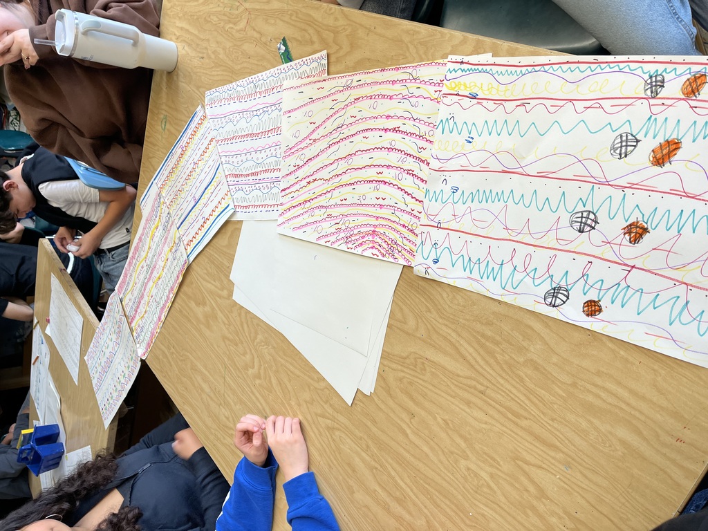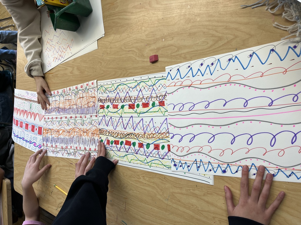 Day 1: Students categorize different kinds of lines: dotted, wavy, zig-zag, or dashed lines, and reflect on how lines are used to represent and express various aspects of their lives. Students will answer icebreaker questions by repeating expressive lines across a paper to make patterns. At the end of the class, all segments can be connected to make a giant scarf to create the looongest scarf within their classroom!